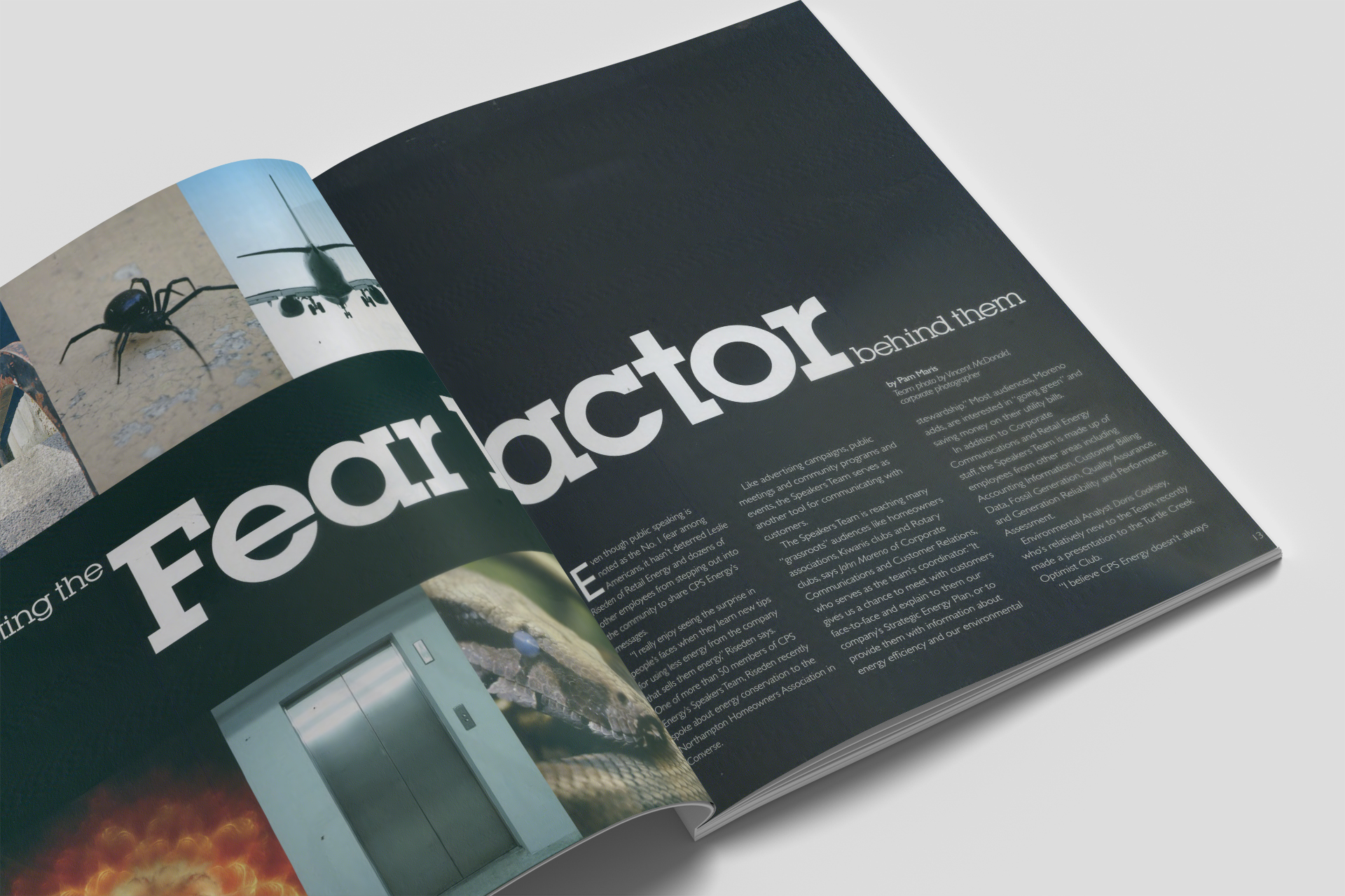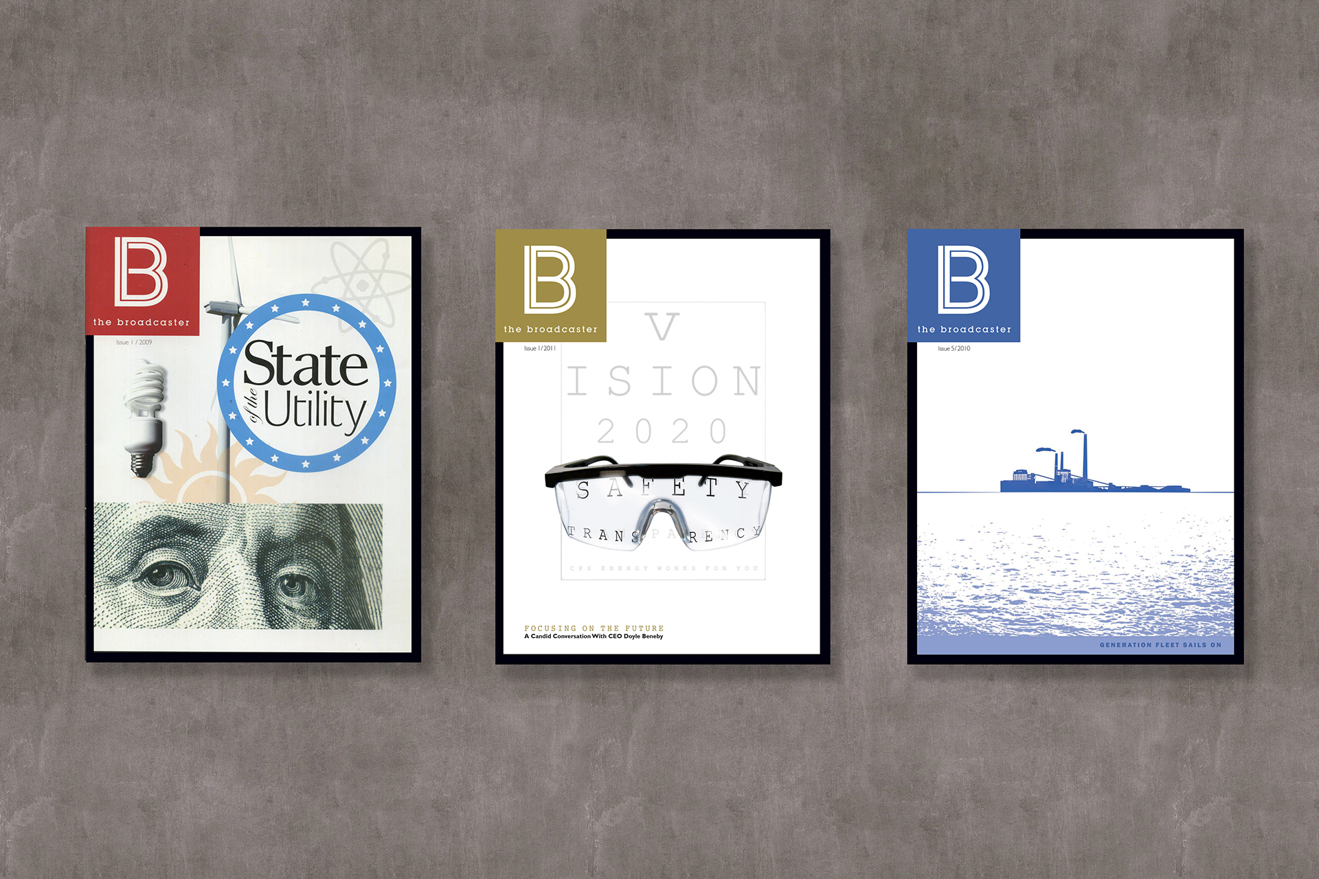 1) CPS Energy employee magazine redesign 1) Annual issue on state of CPS Energy, 2) Vision 2020 - becoming sustainable by 2020, 3) CPS Energy's generation fleet - from a distance the power plants seem to float on Calaveras Lake, like an actual fleet.